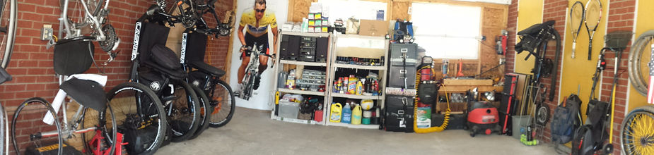 The Back Wall contains all of our shelving, large tools, and also holds the winch that raises and lowers the handcycles and sportchairs on the Handcycle Wall.